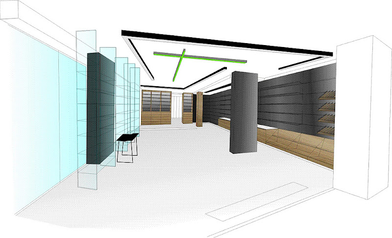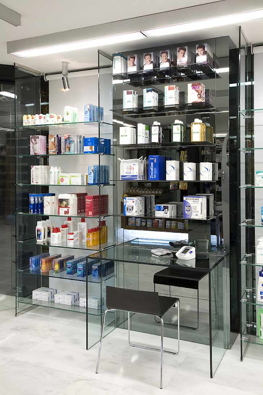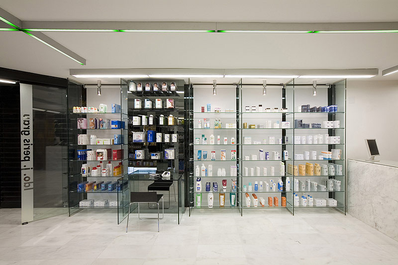La ausencia de falso techo ha obligado a utilizar elementos de iluminación de superficie que contribuyen, junto con las luces continuas indirectas, a dotar a la farmacia de una atmósfera mística.