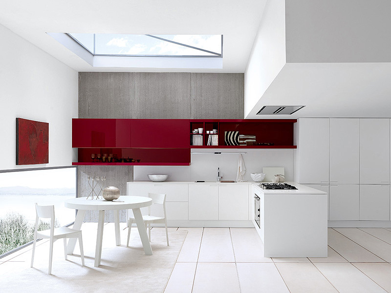 Cherry está disponible con acabado de madera de roble en tonos gris plomo, ceniza y blanco. Al igual que City, los lacados brillantes pueden combinarse con los nuevos colores capuchino, rojo cereza, azul grisáceo y blanco nieve.