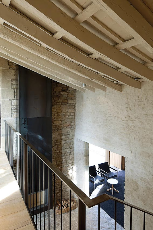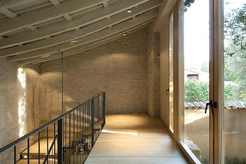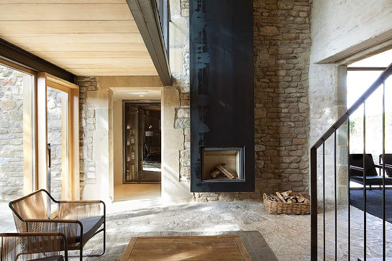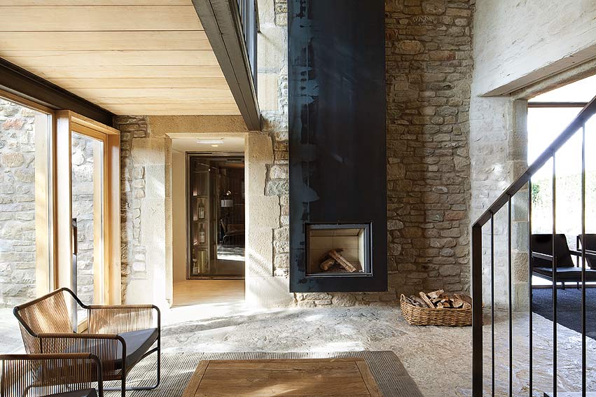 En el interior, un velo blanco roto -en paredes y techos- ha servido para unificar las diferentes estancias y crear un telón de fondo neutro, donde el nuevo mobiliario y los complementos adquieren mayor protagonismo en un entorno vestido con materiales tan nobles como la madera, la piedra y el hierro. Así, el suelo de madera junto a la carpintería de roble aportan una extrema calidez, mientras el hierro se abre paso en los huecos de los muros y da vida a los muebles de líneas rectas o a la caja de la chimenea. Rompedor es el lacado en blanco de los muebles auxiliares, combinado con cueros curtidos de Vic, que contrasta sobre las rugosas e irregulares paredes de piedra.