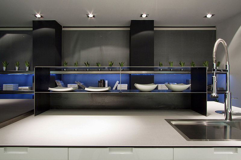 El estudio Circulocuadrado ha apostado en esta edición por un proyecto limpio, con una distribución organizada, de formas muy puras en el que el único criterio es la funcionalidad. Una gran cocina en blanco y negro, donde una gran isla central acoge las principales zonas de trabajo (agua y cocción), que se prolonga con una zona de office adyacente, formada por una mesa y dos bancos en lugar de las tradicionales sillas.