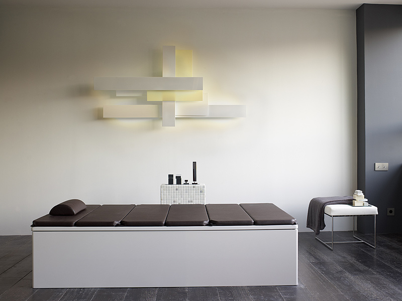 Una con unos focos orientados en un techo falso, proyectan la luz contra la superficie del armario. La otra consiste en fluorescentes escondidos en unos elementos laterales de la misma madera que el revestimiento de la pared, que consiguen tensar el espacio recuperando la sensación de las entradas de luz natural que generan las ventanas.