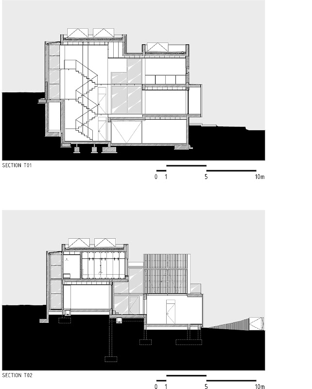 En el exterior, una envoltura de hormigón realizada “in situ”, integra las paredes exteriores en una doble fila de mampostería de bloques cerámicos perforados, que incluye paneles rígidos de aislamiento térmico.