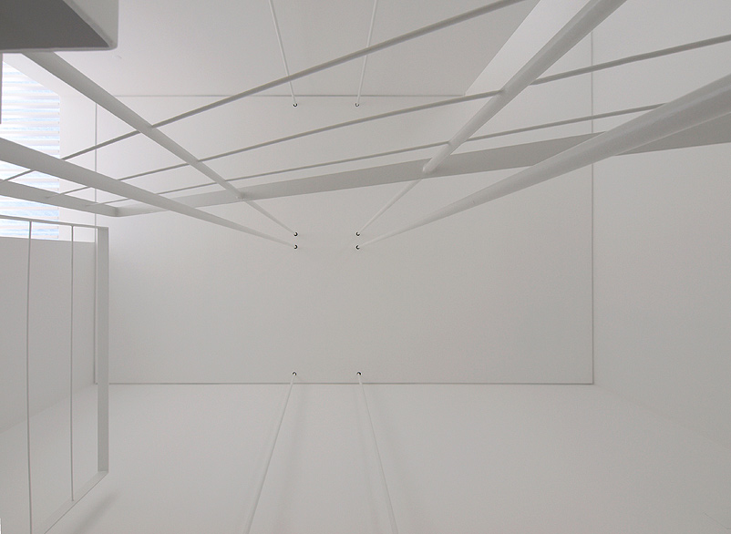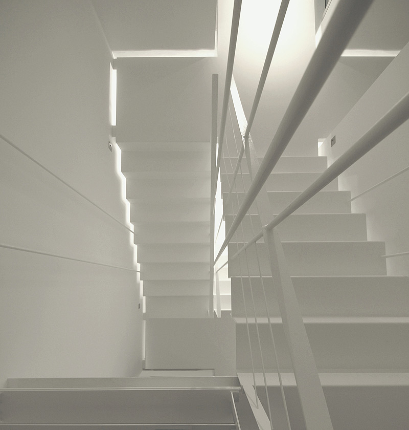 Esta uniformidad nívea se respira en casi todos los lugares de la residencia: las zonas de paso, como el pasillo principal y la escalera, que son de metal pintado en color blanco y se separan sutilmente de las paredes, dejando que la luz pueda pasar entre medio. También las paredes externas e internas, acabadas en yeso, están acabadas en el mismo color.