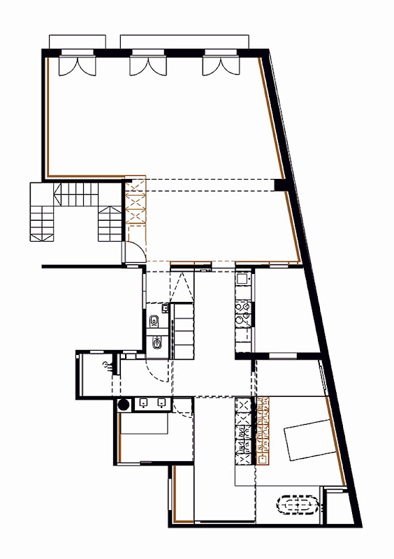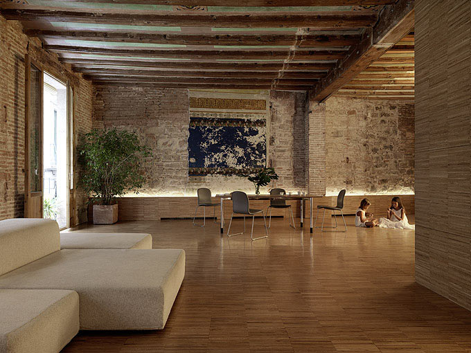 Por otra parte, la cruz blanca central no sólo configura la distribución del piso sino también su estética. Esta moderna isla de luz, que brilla entre paredes centenarias, significa la separación entre “lo nuevo” y “lo viejo”. En el resto del espacio, las paredes y techos se han dejado en su estado original, conservando la piedra vista sin pulir o los irregulares enyesados, que se han barnizado para protegerlos.