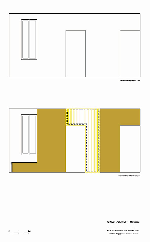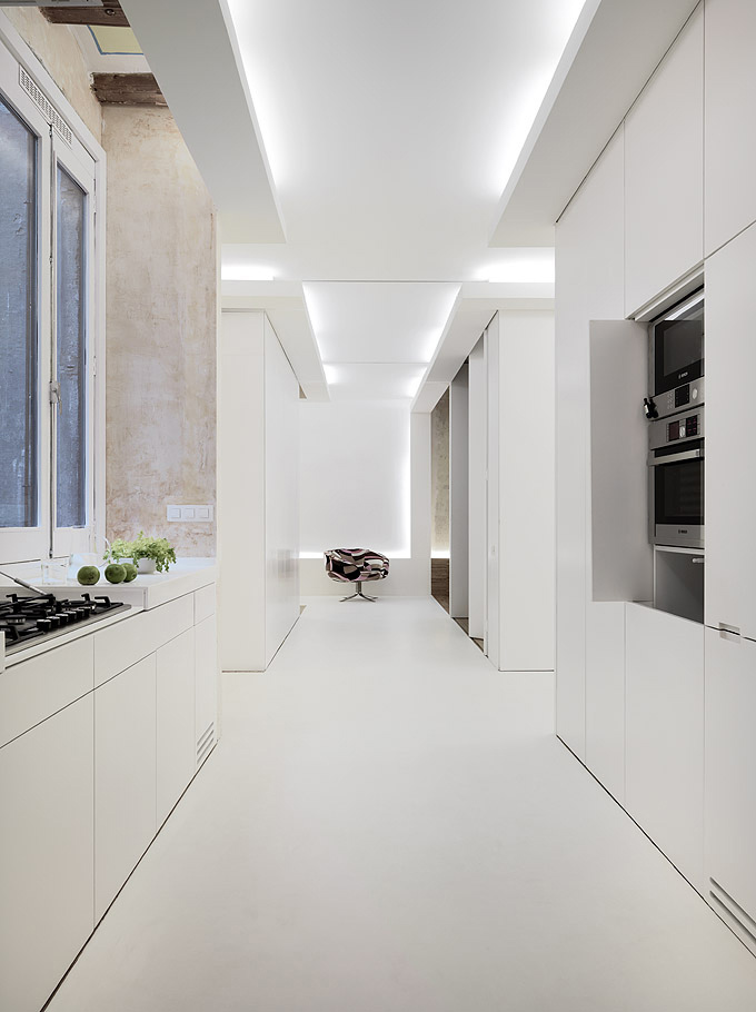El problema se resolvió cruzando dos programas: la cocina y el baño, formando una cruz blanca (Crusch Alba). Así se creó un eje de circulación para la parte más complicada y oscura de la vivienda donde se encuentran la cocina, los tres dormitorios y el baño. La cruz se ha revestido con materiales blancos potenciados con una intensa iluminación. La cocina y el baño se utilizan también como zonas de paso, por lo todo está escondido en armarios que hacen la función de paredes.