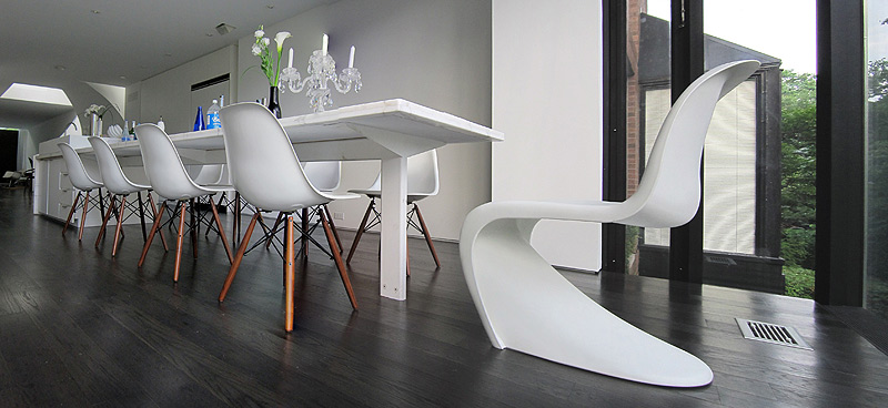 La renovación llevada a cabo por el estudio canadiense gh3 reabrió la planta baja, que se convirtió en un espacio tipo loft, con la entrada en la zona central y dos espacios separados por una escultural escalera: la cocina-comedor, a un lado, y el salón, al otro. Esta sensación de amplitud todavía se prolonga más gracias a la instalación de una nueva pared acristalada en el jardín de la zona posterior de la casa, que consigue transportar el espacio exterior hacia el interior.