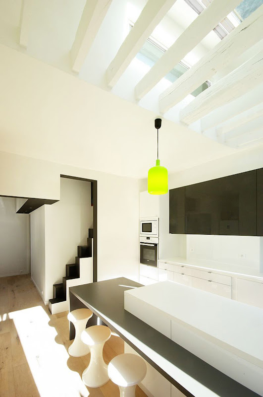 Anne-Julie Martinon y Marc-Antoine Richard, del estudio MAAJ Architectes son los responsables de la rehabilitación de este pequeño dúplex en París. La intervención ha intentado mantener el reducido espacio lo más limpio posible jugando con la sencillez en el diseño, la luz natural y la duplicidad de funciones en diferentes elementos.