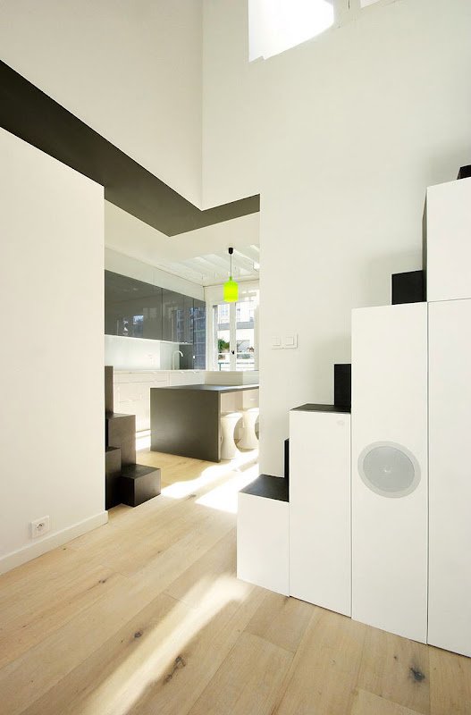 La esencia del proyecto se ha centrado en el acceso a la buhardilla donde se han ubicado dos habitaciones. En este doble espacio, Martinon y Richard han diseñado un juego de dos escaleras. Situadas una frente a la otra, cada una conduce a una diferente habitación. Las huellas y contrahuellas se han pintado intencionadamente de negro para destacar en un interior predominantemente blanco.