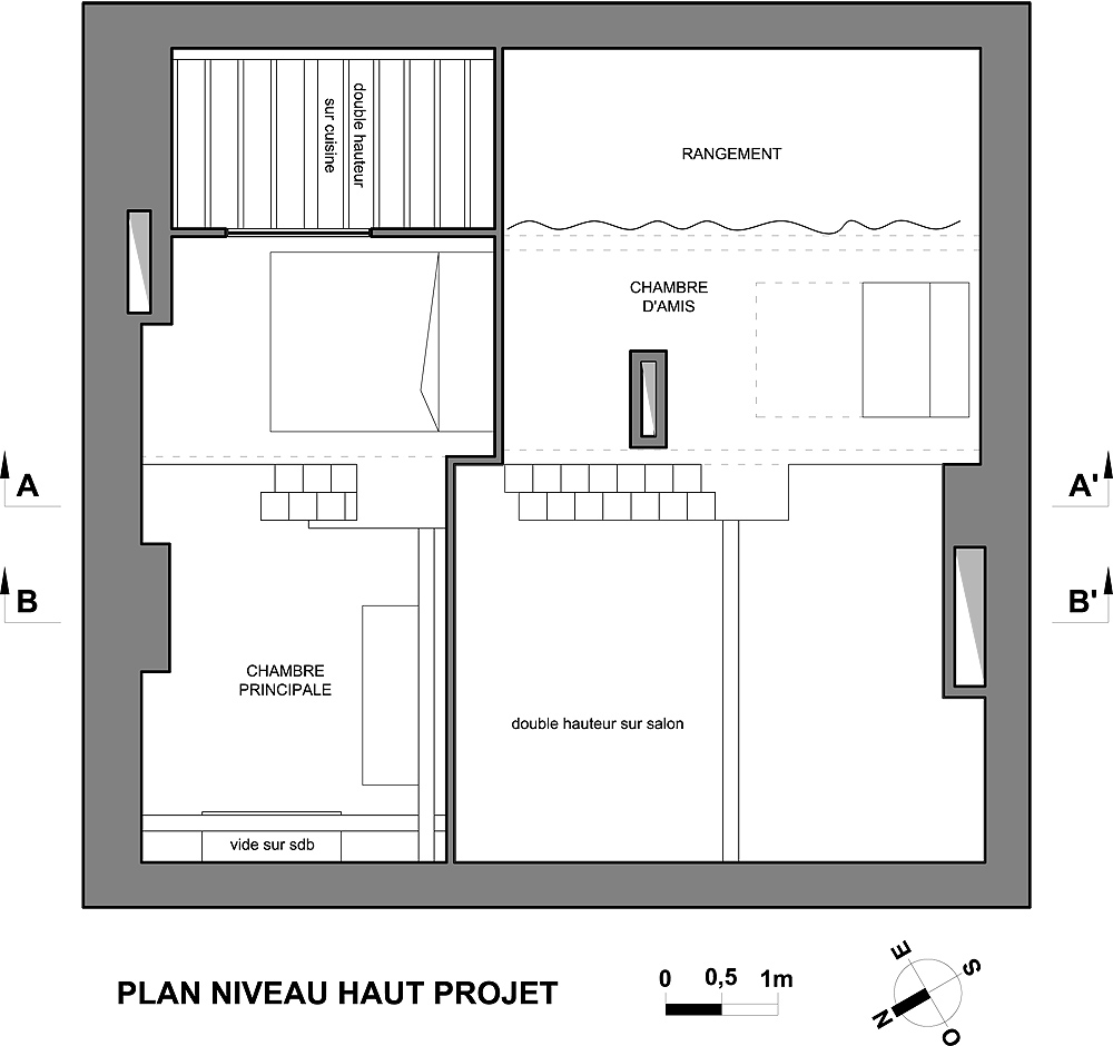 La esencia del proyecto se ha centrado en el acceso a la buhardilla donde se han ubicado dos habitaciones. En este doble espacio, Martinon y Richard han diseñado un juego de dos escaleras. Situadas una frente a la otra, cada una conduce a una diferente habitación. Las huellas y contrahuellas se han pintado intencionadamente de negro para destacar en un interior predominantemente blanco.