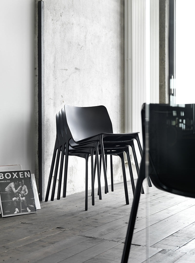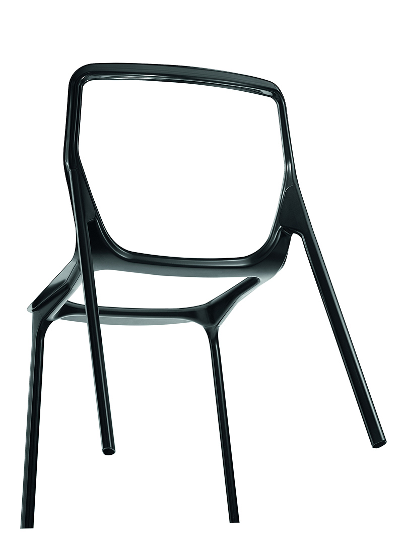 También la coquilla recambiable del asiento y respaldo se caracteriza por su diseño industrial. Realizada en una sola pieza, va tensada sobre el marco a modo de membrana y está hecha de polipropileno granulado en el mismo color que el armazón (blanco, negro o gris). Además, es de fácil mantenimiento y resistente a las cargas mecánicas.