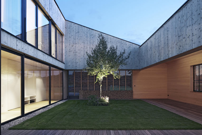 La vida interior de la casa gira en torno a un patio-jardín que se ha configurado con un número mínimo de elementos: el cesped, la tarima de madera y la grava. En uno de sus lados, hay plantado un único árbol, que se ilumina de forma que por la noche se consigue un efecto teatral.