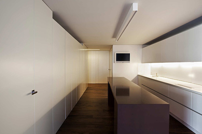 Los autores han optado por potenciar al máximo el salón-estar mediante grandes ventanales que permiten disfrutar de una gran terraza revestida con una tarima de madera, que da al patio de manzana. En sentido contrario, desde la terraza se tiene una interesante visión panorámica del interior de la vivienda: desde el salón -con la cocina al fondo- hasta el dormitorio principal.