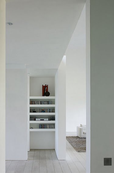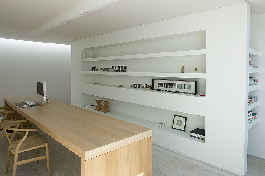 Recorrerla, entre paredes blancas y sobre un suelo de madera, deja constancia de la búsqueda de espacios diáfanos, no recargados, en los que el mobiliario y los equipamientos adosados a las paredes adoptan el color blanco de éstas, mientras que el suelo de madera clara guarda consonancia con el mobiliario, como mimetizándose. Pocos son los puntos de color intenso dentro de la suave y elegante gama cromática, solamente la chimenea, las barandillas o los cantos rodados del patio interior.