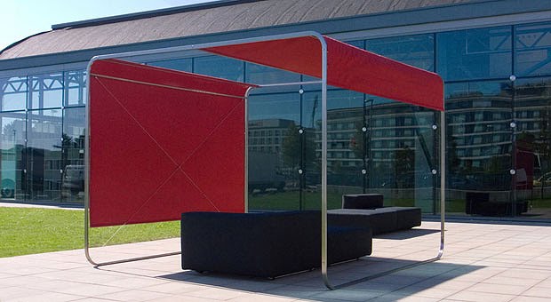 Realizada con materiales 100 % resistentes a la intemperie como el acero inoxidable y fibras acrílicas. El tejido se puede desmontar para su limpieza y está disponible en varios colores. Medidas: 300 x 300 x 230 h cm.