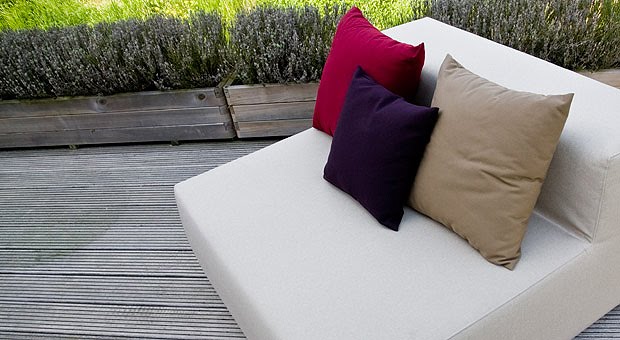 Sofá fabricado con espuma de alta calidad y la misma tapicería empleada en los muebles de esta firma (resistente para su uso en el mar y totalmente impermeable). Está cosido con hilo Synton (un hilo de montaje extraordinariamente fino), impermeable para que el agua tampoco pueda entrar por los agujeros hechos por la aguja. Además, es un tejido agradable al tacto, muy resistente y fácil de limpiar. La estructura es de acero inoxidable. Medidas: 110 x 110 x 76 h cm.