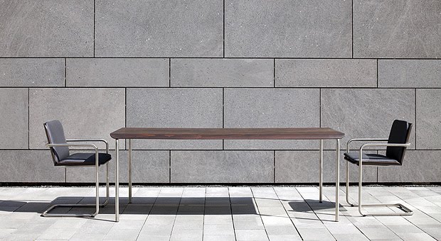 Su bastidor de una sola pieza está hecho con tubo de acero inoxidable (V2A) con un diámetro de 30 mm. El tablero es de 9 mm de grosor y se compone de nueve chapas de madera de haya pegadas con resina de melamina y comprimidas a alta presión. Medidas: 160 x 88 x 75 h cm y 200 x 88 x 75 h cm.