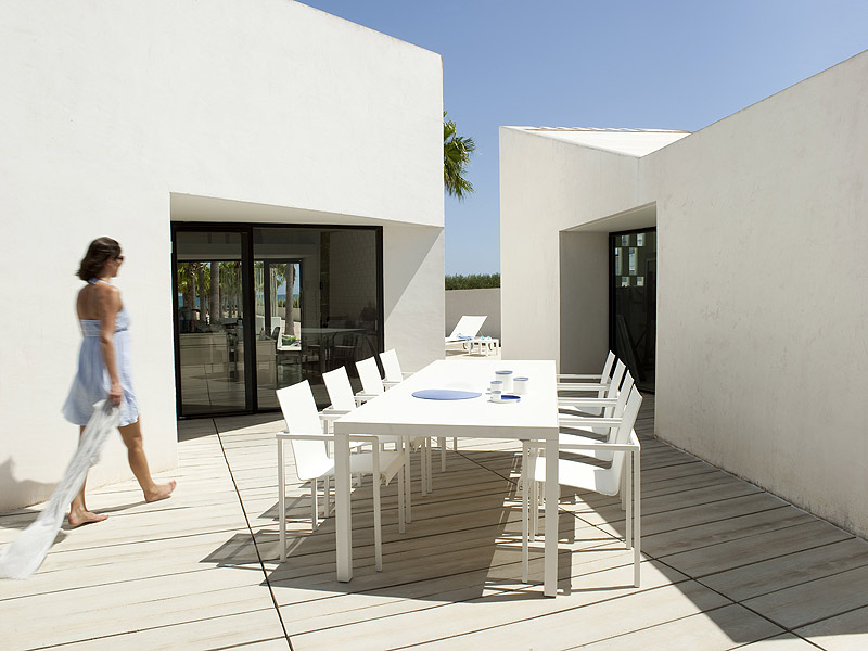 Para los que quieran tumbarse, hay un sillón regulable de dos posiciones, que puede completarse con un reposapiés y un reposacabezas, y una tumbona. La serie está fabricada en aluminio con revestimiento en polvo y es de color blanco.