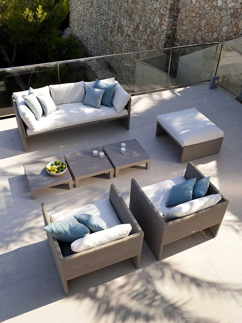 Un sofá de exterior con apariencia de interior, cuyas tres piezas básicas (sillón individual, rinconera y puf) permiten realizar diferentes composiciones. El catálogo deja elegir para los cojines entre Skai® náutico de color blanco, resistente a los rayos UV, a las manchas, a la formación formación de hongos, al cloro y al agua salada, que se utiliza en yates, o un material náutico en los colores plata o piedra. Un revestimiento especial en la parte posterior hace que el agua no pueda entrar en ellos. Se completa con dos mesitas auxiliares (45 x 45 x 44 cm y 120 x 70 x 27 cm). La estructura es de aluminio con un revestimiento de pintura en polvo.