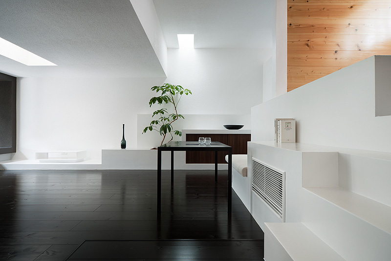 Como la construcción dispone de pocas aberturas al exterior, se han abierto en el techo una serie de lucernarios y claraboyas que proporcionan suficiente luz natural al interior. El proyecto también incorpora una serie de piezas de mobiliario integrado, como la tarima blanca del salón dispuesta en varios niveles o el banco que enmarca inferiormente la ventana principal y que permite sentarse de forma espontánea o, incluso, comer de manera informal.