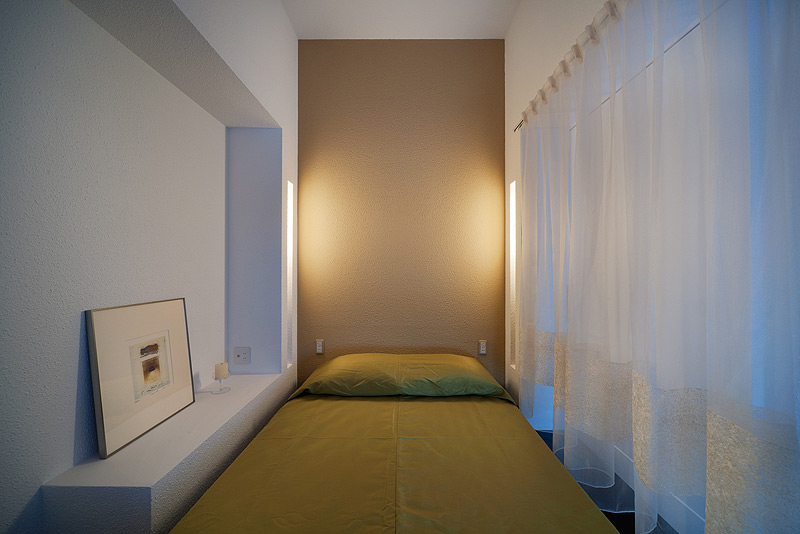 De manera similar al rincón de estudio, y en la zona privada, se ha ubicado una pequeña habitación en una plataforma elevada. Para evitar la sensación de encajonamiento, una de las paredes se ha sustituido por una ligera cortina.