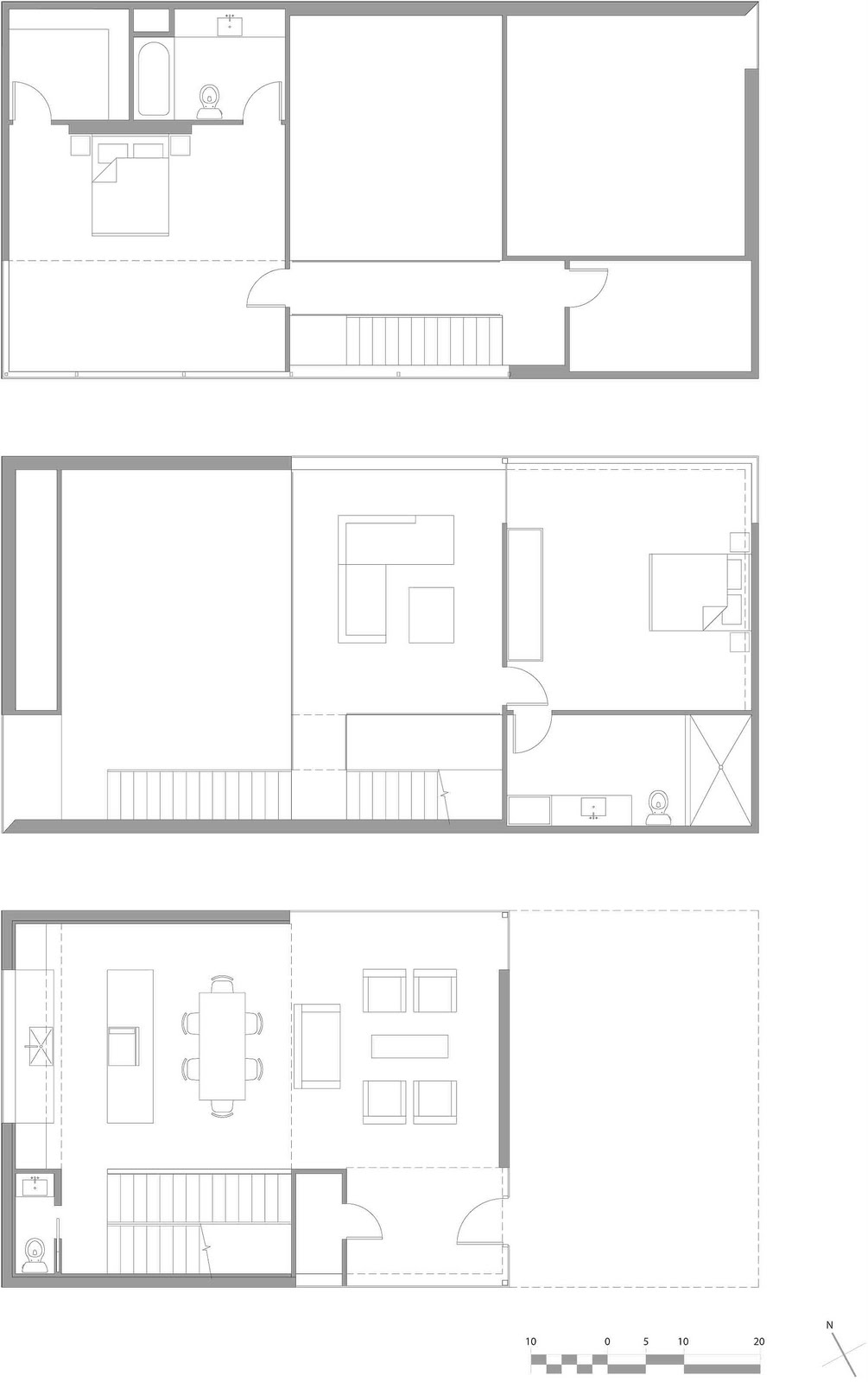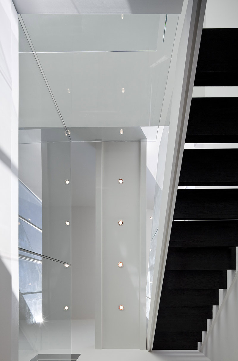 Los tres niveles están unidos por una escalera que los cruza en una serie de cortes en diagonal que se deslizan a través del espacio vertical. El color blanco es el protagonista del interior: paredes blancas, techos blancos y parte del mobiliario en blanco. Sólo el pavimento y las huellas de la escalera presentan un intenso tono oscuro.