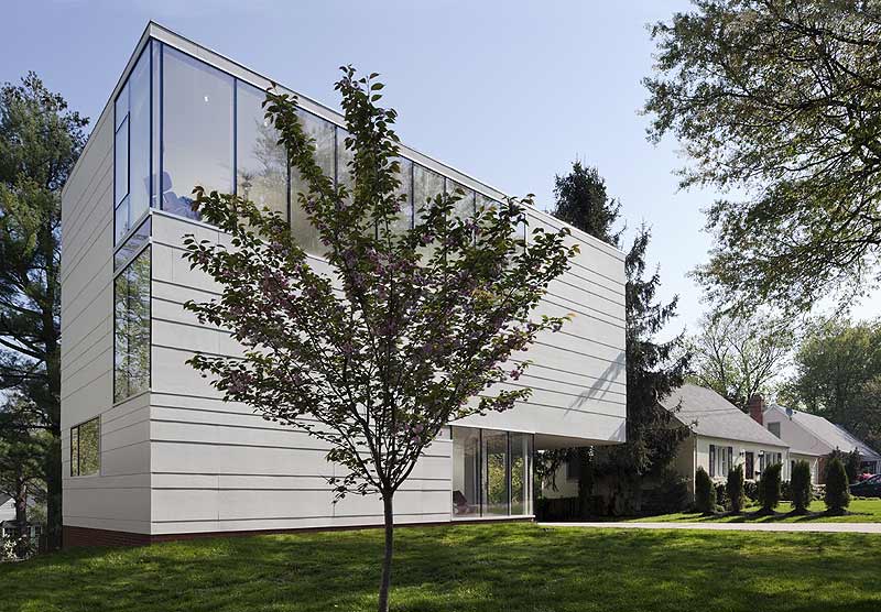 Los 210 m2 de la residencia Kensington adoptan la forma simple de un cubo, cuya pureza de líneas sólo se ve interrumpida en el exterior por el vacío que ejerce la función de porche y se convierte en acceso principal a la casa. Las paredes de la fachadas están recubiertas por paneles de cemento que se han superpuesto de la misma manera que las tejas de las cubiertas tradicionales, creando un delicado efecto alistonado.