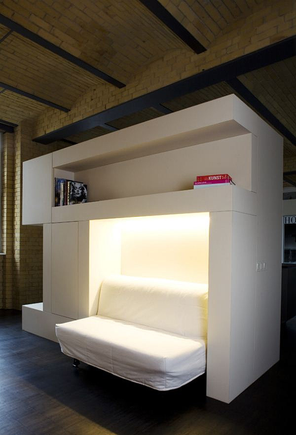 Debido a este enfoque minimalista dado a la reconstrucción, el nuevo diseño interior a cargo de Wienands se centró en elegir cuidadosamente tanto los materiales como los detalles del mobiliario. Por ejemplo: las superficies de los muebles son de linóleo blanco y negro, lo que ha permitido combinar varios módulos individuales a la carta. Para tener un efecto visual lo más limpio posible, todas las superficies delanteras son cuadradas y carecen de asas. Sus mecanismos de apertura y cierre siempre se realizan mediante control electrónico o magnético.