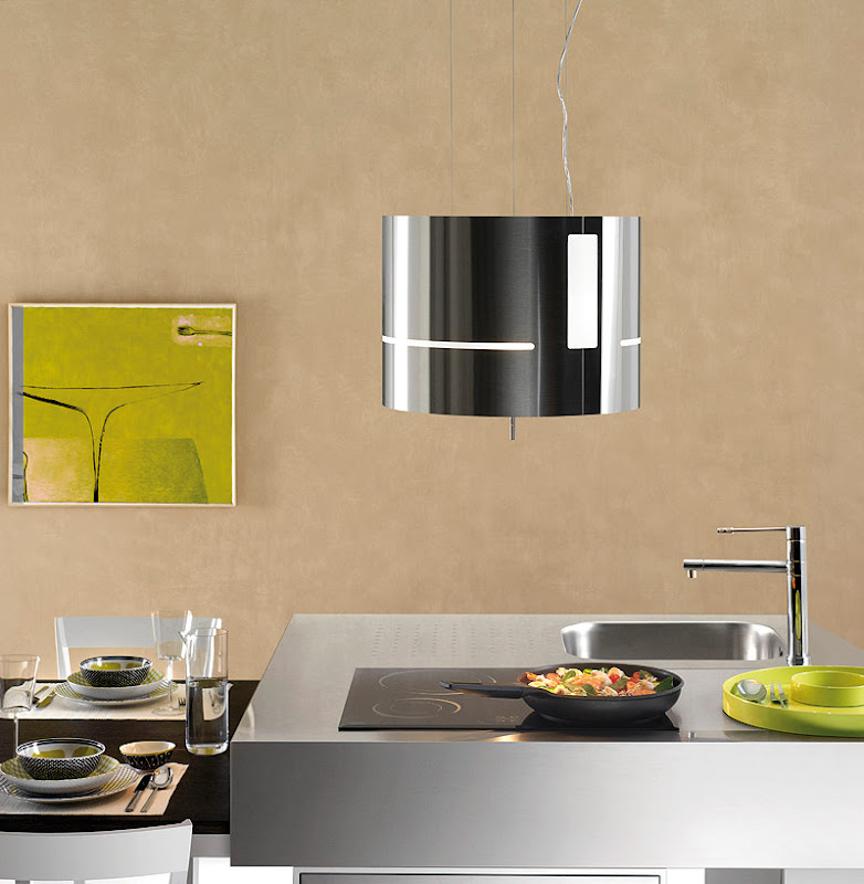 Realizada en acero inoxidable, Evolution Isla desempeña su tradicional función y, al mismo tiempo, se convierte en parte importante de la iluminación de la cocina ya que está dotada de una lámpara halógena capaz de generar hasta tres veces más luz que una convencional.