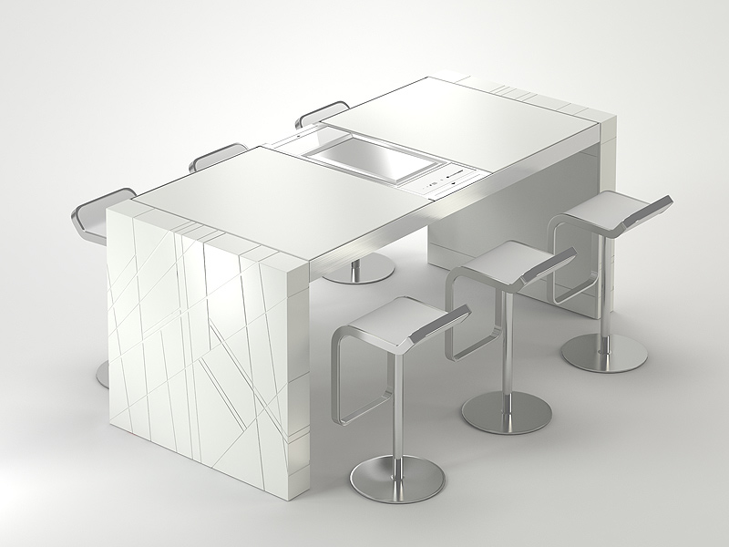 livecookintable ® Solitaer es un moderno concepto de cocina cuya filosofía hay que buscarla en las costumbres japonesas, donde es señal de hospitalidad y respeto que el anfitrión cocine delante de sus huéspedes. Atrás han quedado los días de bullicio y ajetreo en la cocina mientras los invitados esperaban la comida. Esta mesa-cocina encaja perfectamente con esta tendencia que parece estar poniéndose cada vez de moda al mismo tiempo que ofrece unas posibilidades técnicas acordes con la época actual.
