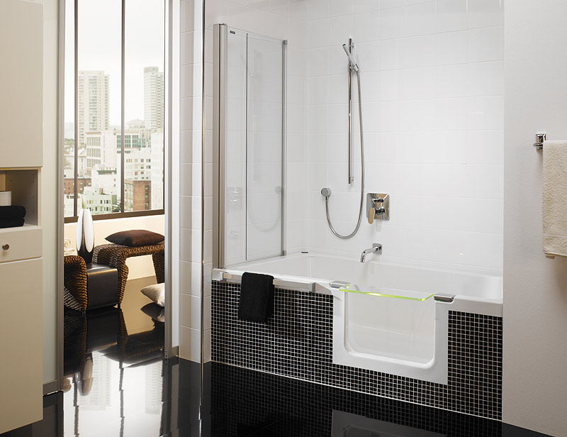 Piccolo Step-in: una solución para baños pequeños que combina ducha y bañera. Cuando se utiliza para el baño, la puerta acrílica se encaja en la pared de la bañera y garantiza una estanqueidad fiable. Además, un sensor controla el nivel del agua y evita que el panel sea retirado si está llena. Medidas: 170 x 70 / 94 x 46 cm.