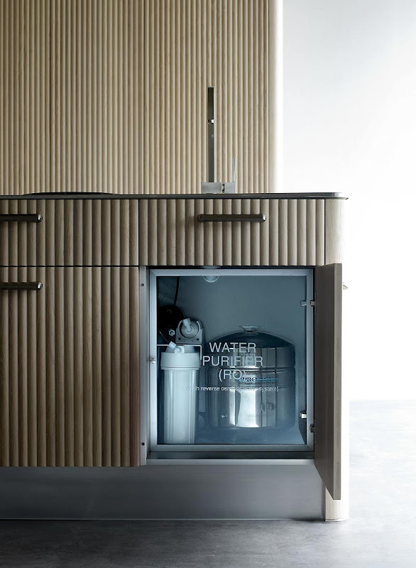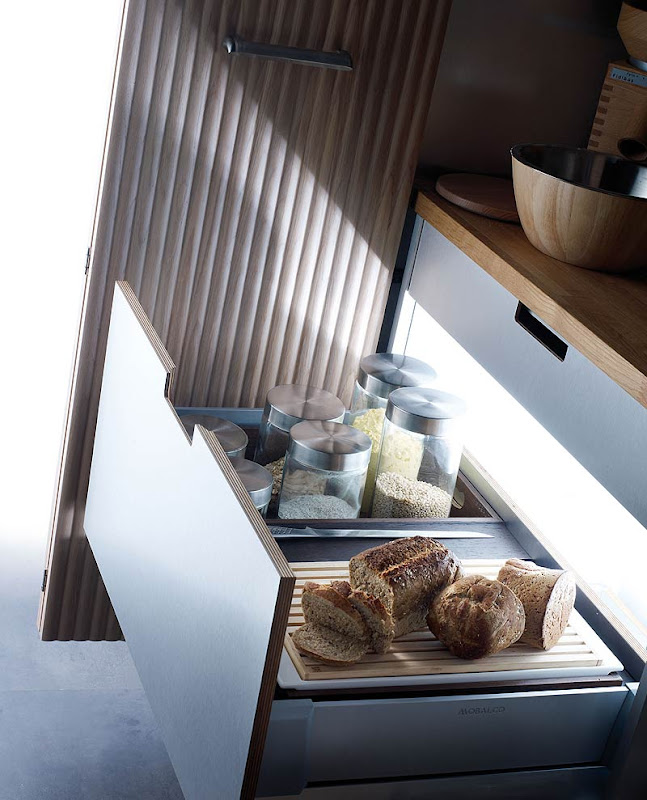 En esta cocina de líneas agradables y aristas suavizadas, el equipamiento y los accesorios están organizados por tareas e integrados en módulos independientes: zona de herramientas (licuadora, germinador de semillas, molinillo de cereales, depuradora de agua por osmósis inversa). Además, cuenta con elementos exclusivos como los enmarques en acero, construidos de una sola pieza mediante un proceso especial patentado y desarrollado por Mobalco.