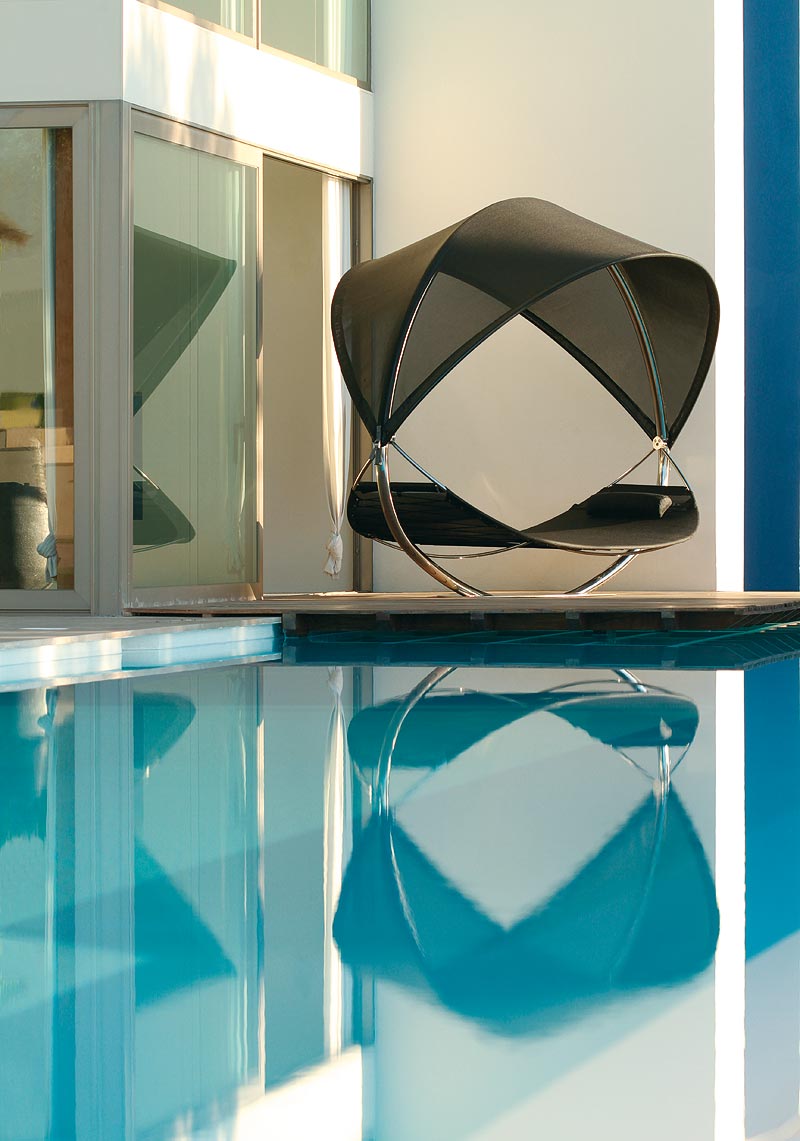 La hamaca Surf es la hermana pequeña de la Wave, más compacta y fácil de instalar. Surf es una combinación entre una estructura de acero inoxidable y una base en forma de tabla de Surf que le aporta su forma aerodinámica. La estructura presenta una gran ligereza visual, garantizando la máxima resistencia y confort para dos personas. Para montarla, se sujeta en el suelo mediante un anclaje y gracias a una base móvil opcional se puede cambiar de sentido. Disponible en blanco, gris, negro y turquesa. Medidas: 245 x 200 x 337 h cm.