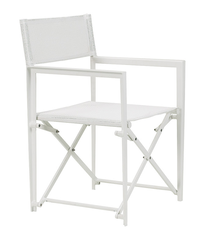 Colección de líneas minimalistas, realizada en aluminio, tejidos batyline con atractivos detalles, madera de teca para las superficies o cerámica vidriada. Una butaca, una silla de director con su mesa a juego (80 x 80, 180 x 90, 240 x100 cm) son algunas de las piezas que integran esta serie disponible en color blanco o capuccino.