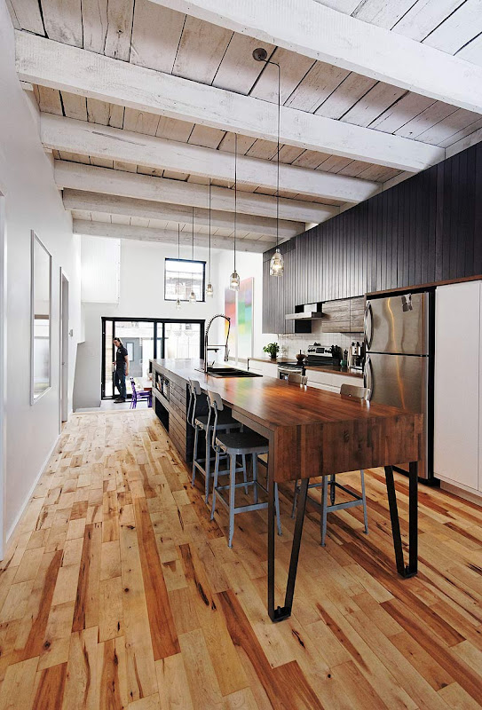 La primera acción que se llevó a cabo fue bajar el nuevo comedor al nivel de la terraza exterior y vincularlo con la cocina y una habitación a través de un gran espacio abierto. Suspendido sobre el comedor, un cubo se adelanta del dormitorio principal y se asoma sobre el comedor. Mientras tanto, una claraboya en el techo asegura que la luz solar directa ilumine esta zona durante todo el día. La cocina se organiza en torno a un gran mostrador central que se convierte en el foco de la vida social de la casa.