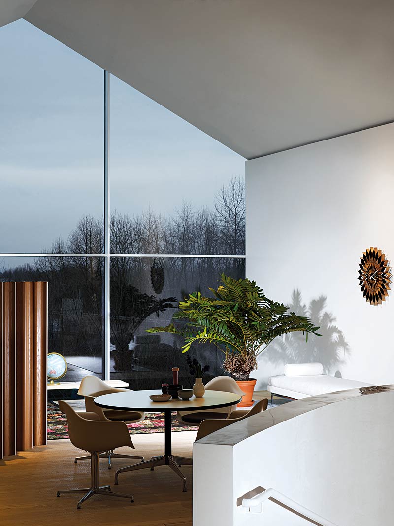 En el interior de conjunto de “casitas” superpuestas, los diseños de la Vitra Home Collection están expuestos en distintos ambientes laborales y domésticos, a los que se ha sumado una selección de sillas de los siglos XIX y XX sacadas del Vitra Design Museum, situado también en el Campus. Piezas clásicas de Charles y Ray Eames, George Nelson, Isamu Noguchi, Jean Prouvé y Verner Panton se exhiben junto con diseños contemporáneos de Maarten Van Severen, Ronan y Erwan Bouroullec, Antonio Citterio, Hella Jongerius o Jasper Morrison, entre otros.