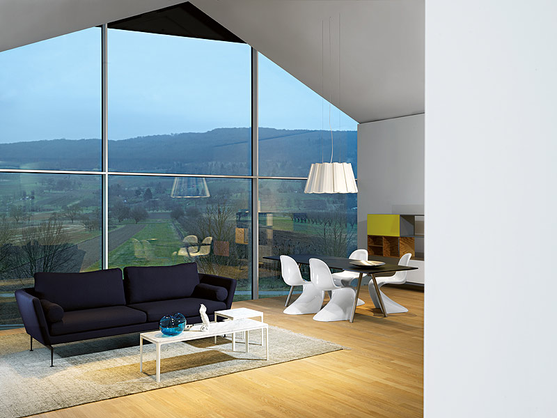 Después de esta “invasión” de productos foráneos, llegó la hora de dejar que la arquitectura de Herzog y de Meuron influyera también sobre el Vitra Campus. En el caso de VitraHaus, el regreso a casa no se refiere únicamente a los arquitectos, sino también a la idea del edificio: Herzog y de Meuron han tomado una forma constructiva típica, la casa con tejado a dos aguas, la han estirado longitudinalmente y han ido superponiendo varias construcciones, casi infantiles, que crean asombrosas perspectivas al atravesarse unas sobre las otras mientras se convierten en cajas de sorpresas con unas asombrosas vistas del paisaje exterior.