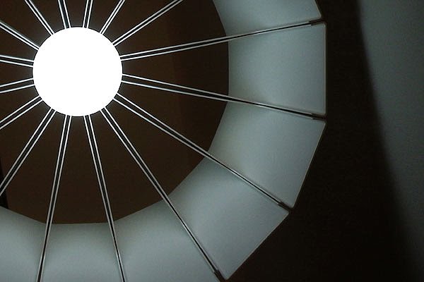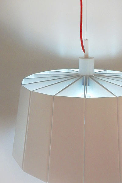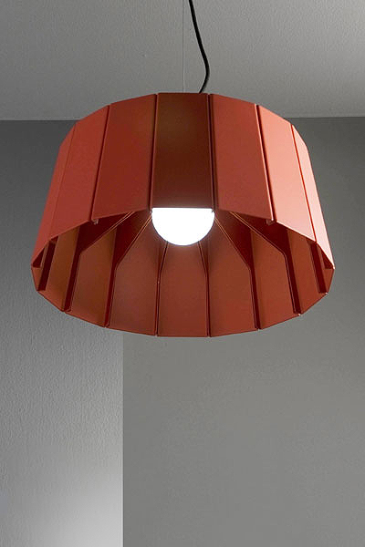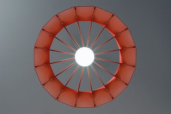 Esta luminaria de suspensión está formada por dieciséis elementos idénticos que rodean a la fuente de luz y dan lugar a la pantalla. En ella se dibujan claramente las diferentes piezas, produciendo un efecto simétrico.