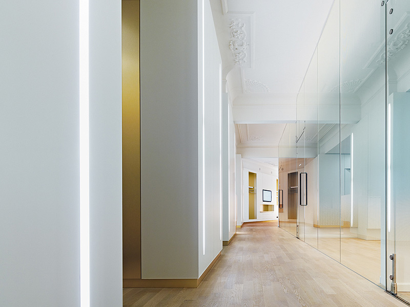 Al mismo tiempo, la excelente ornamentación de estuco de las habitaciones y la continuidad del pavimento de roble permanece completamente visible desde el pasillo, dando a todo el espacio un carácter fluido.
