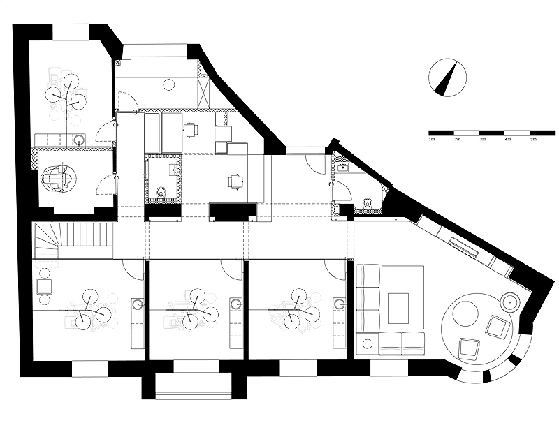 Para la nueva vida laboral que se iba a desarrollar en la antigua vivienda, ha sido necesario reorganizar completamente la distribución. Así, en lo que era el vestíbulo se han ubicado, en una misma unidad, la recepción y un aseo para el uso del personal de la clínica, mientras que a la izquierda de la puerta de entrada se encuentra el lavabo para los clientes. Detrás de esta unidad, y separadas de ésta por un pasillo, se han ubicado una sala de rayos X y una sala de tratamiento. El tramo de pared, que una vez separó el recibidor de una fila de habitaciones, ha sido reemplazado por una serie de unidades en ángulo recto, que contrastan de forma clara con el llamativo techo original.
