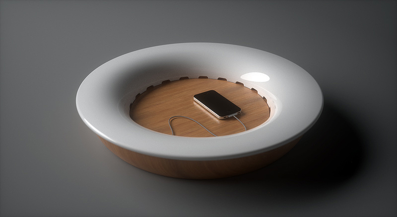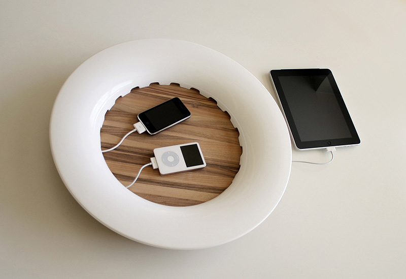 Llama la atención que un diseño que combina madera y cerámica bajo una estética tan tradicional sea en realidad un “muelle de carga” donde poder recargar la mayor parte de nuestros dispositivos: el iPhone, los teléfonos, el iPod, el iPad, las cámaras, etc. Su diseño permite apoyar sobre la bandeja de madera los distintos dispositivos a recargar, al tiempo que oculta todos los cables. Gracias al disco cerámico que apoya sobre la base de madera, y mediante un simple giro, es posible envolver todos los cables conectados a las tomas USB del interior. Medidas: 52 D x 9 h cm.