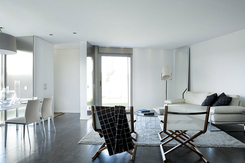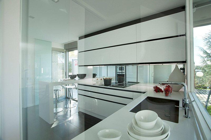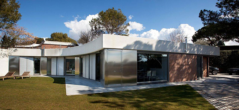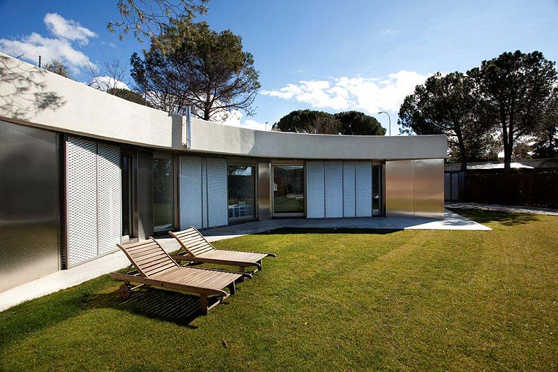 La distribución interna se resuelve mediante un sistema de elementos que parece que van a la deriva, como si se fueran a mover solos de un momento a otro, y que vuelcan al interior de la parcela. De este modo, aparece una única fachada que se concibe como algo etéreo, de vidrio, acero inoxidable y finos tamices metálicos.