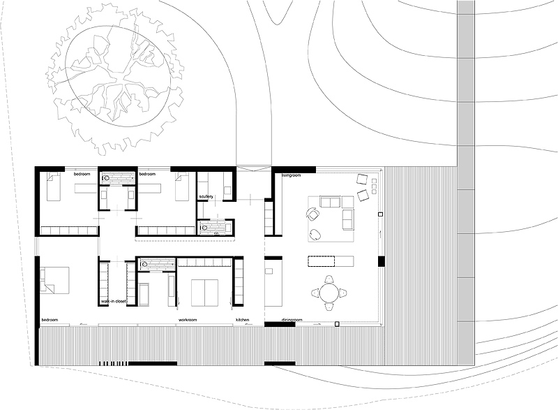 Para romper con el paisaje plano se llevaron a cabo varias acciones como construir el techo del salón comedor ligeramente inclinado y acentuar las colinas, donde en una de ellas se encuentra semienterrado el garaje.