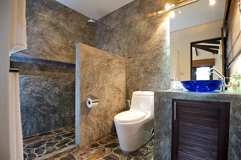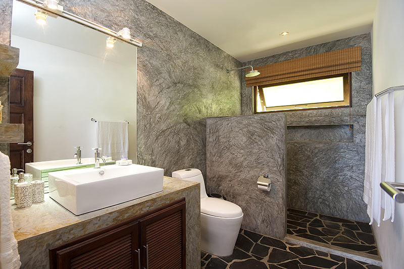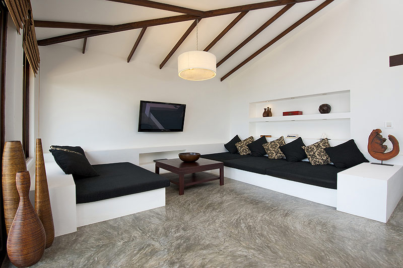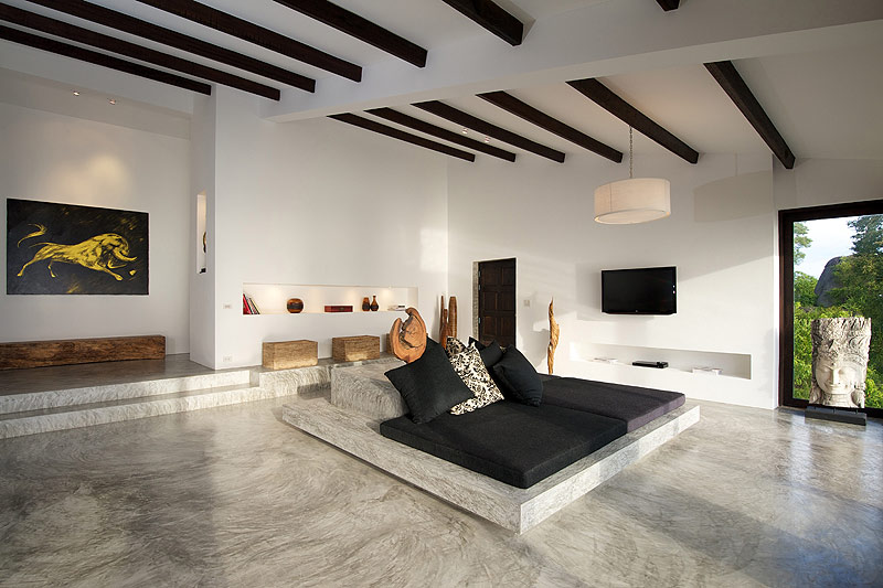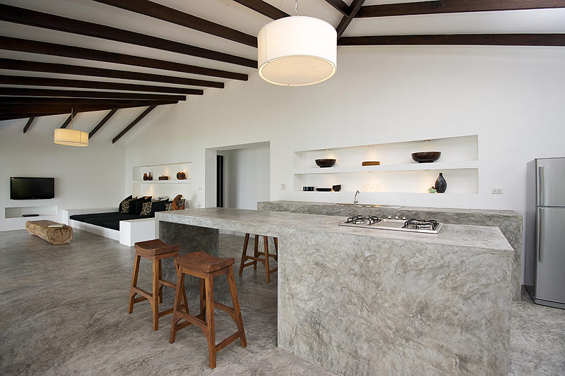 Éste se ha utilizado en los suelos, las bases de las camas, la cocina y el baño para facilitar la limpieza y el mantenimiento de las villas. Y entre blanco y gris, no se ha querido descuidar la presencia de elementos locales tailandeses como los detalles y los productos fabricados con madera del lugar.