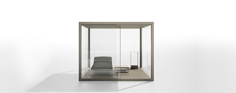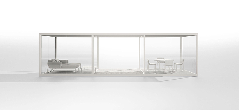 Flat está fabricada con perfilería de aluminio soldado termolacado y polietileno 100% reciclable, y gomaespuma de poliuretano recubierta con tejido hidrófugo. Colores disponibles blanco o bronce.