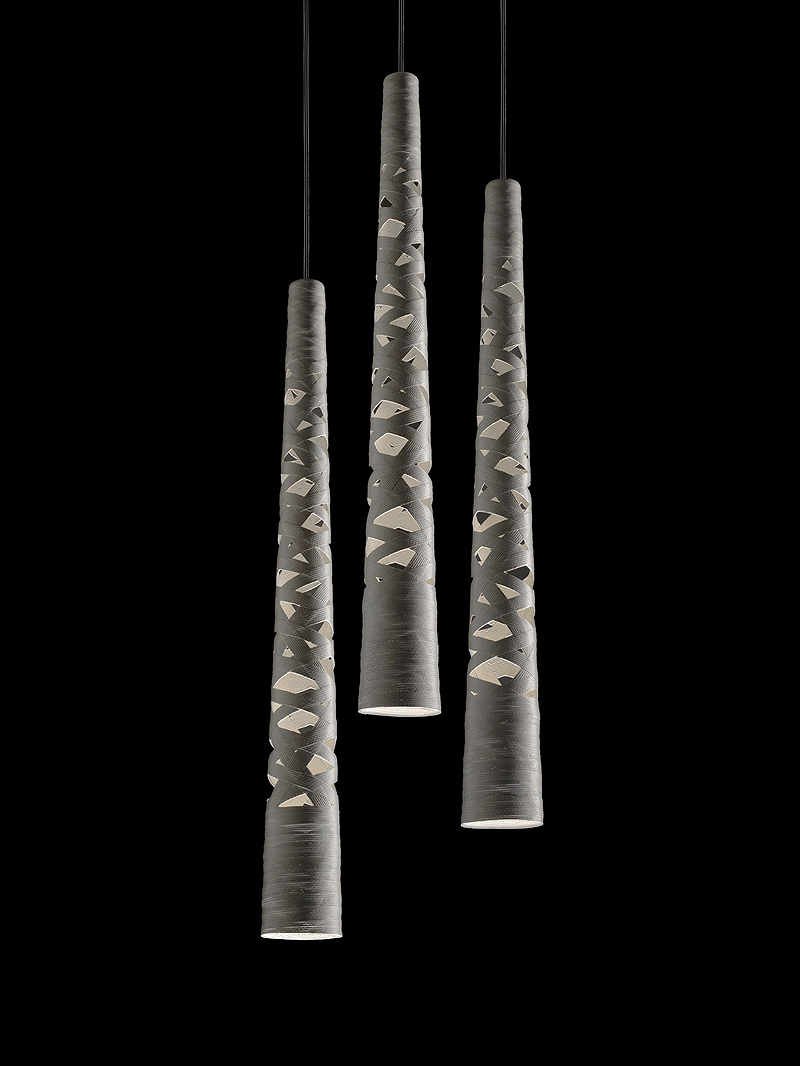 Una luminaria que conjuga rasgos decorativos y funcionalidad técnica, diseñada por LucidiPevere. La parte frontal, que escuda y orienta la luz, es un extruido de metal, mientras que la luz se difunde por diversas aperturas en la parte trasera del difusor que la dirigen hacia arriba y hacia abajo, para una iluminación intensa pero no deslumbrante.