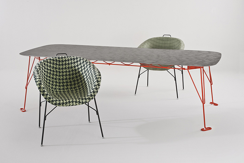 Paola Navone ha diseñado también esta mesa, que forma un buen tándem con sus sillas Eu/phoria. Eus se presenta en dos versiones rectangulares (205 x 105 cm y 250 x 105 cm) y con sobres en vidrio al ácido, serigrafiado o no, un resistente laminado en tono óxido y acabado rugoso, y en Ecomat, un material innovador y ecológico obtenido de la combinación de plástico reciclado y de huesos de aceituna molidos, de color gris y verde. Pero lo que más llama la atención es su ligerísima estructura metálica pintada (blanco, naranja, azul y gris) con sus divertidos y originales pies de apoyo.