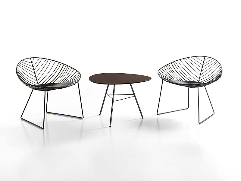 Una mesa liviana y esencial, inspirada en los guijarros pulidos por el agua y las ramas de los árboles que, al igual que la silla de la misma colección, se adapta tanto al uso en exteriores como en interiores.