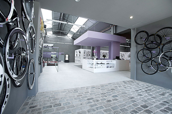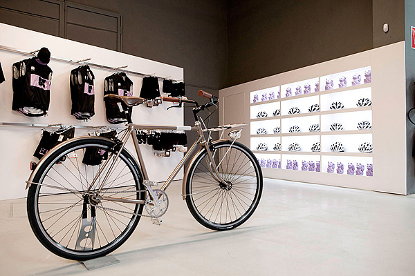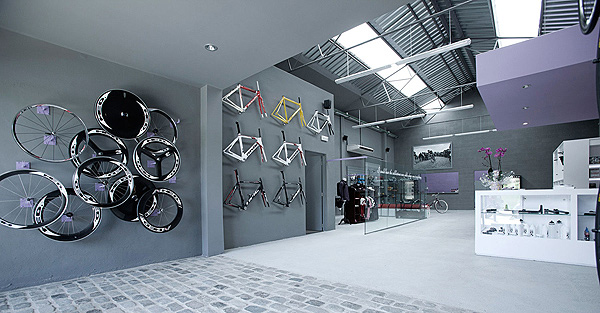 En este universo de cultura ciclista, las bicicletas se muestran como cuadros con luz de fondo. La idea del arquitecto fue presentar los productos como si fueran cuadros en una galería, mediante el recurso de usar vitrinas blancas y luminosas.