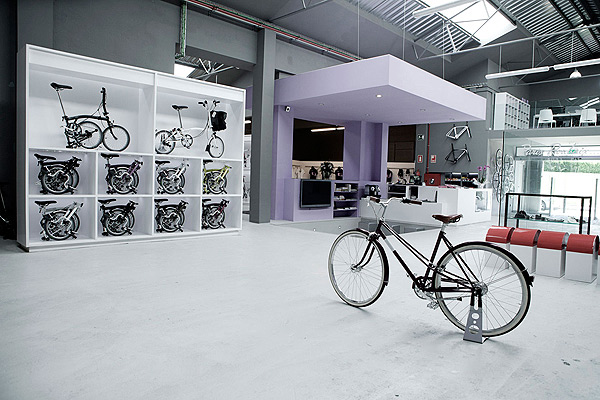 En este universo de cultura ciclista, las bicicletas se muestran como cuadros con luz de fondo. La idea del arquitecto fue presentar los productos como si fueran cuadros en una galería, mediante el recurso de usar vitrinas blancas y luminosas.