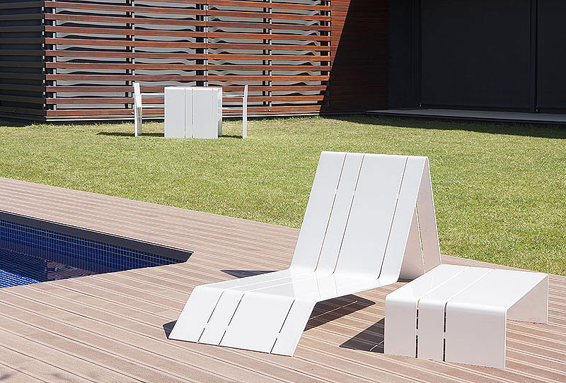 Esta temporada, al diseño sensual de la tumbona Lounge y la silla Calma, se suma ahora un elegante set de mesas y sillas de líneas simples y venguardistas, adecuadas tanto para ambientes de exterior como de interior. Toda la colección está fabricada en aluminio lacado en blanco, un acabado al que se ha prestado una especial atención para que cumpliera los más altos requisitos estéticos y de calidad.